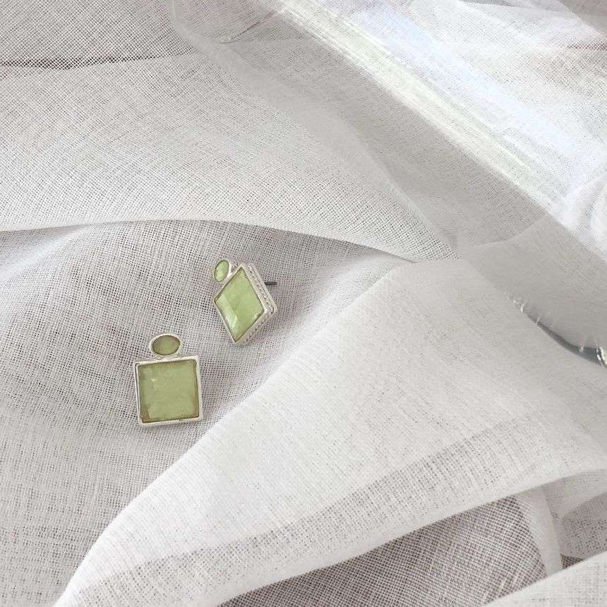 매트한 실버 도금에 옅은 연두빛의 자개를 매치해 만든 귀걸이입니다.