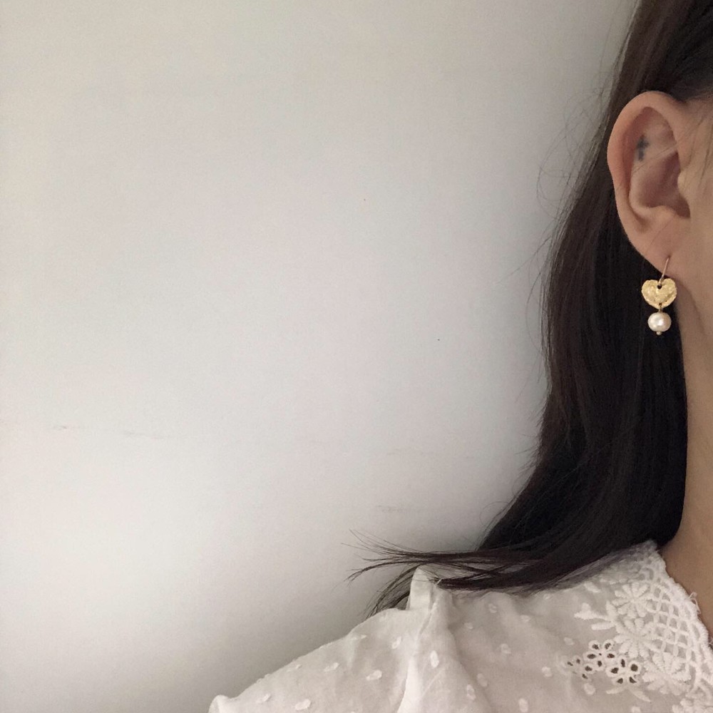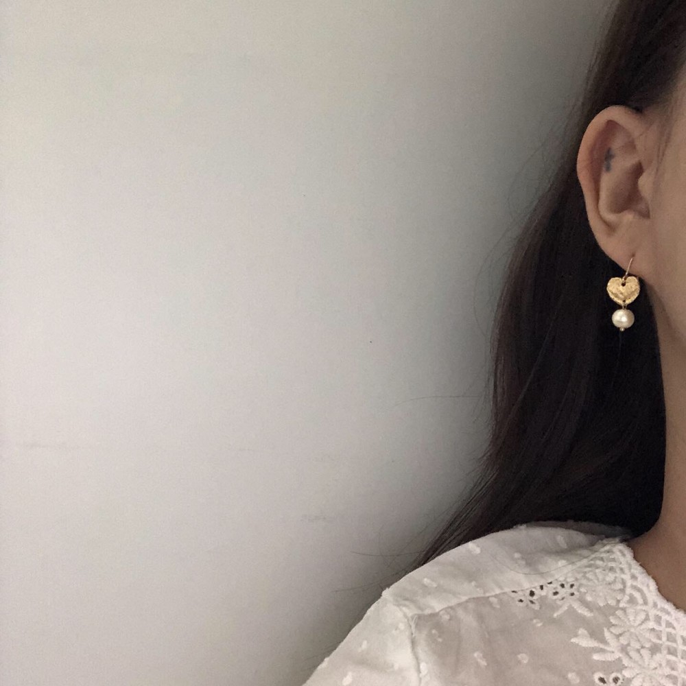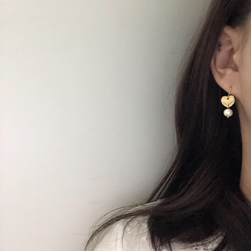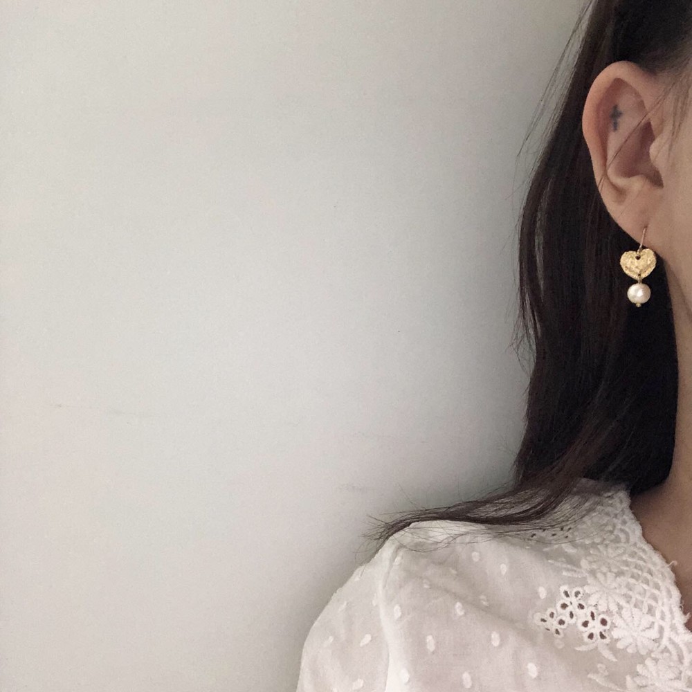 텍스처 있는 하트 유닛에 진주를 더해 제작한 사랑스러운 하트 귀걸이입니다.