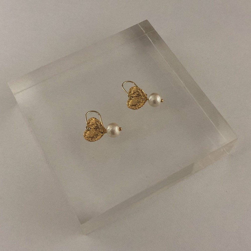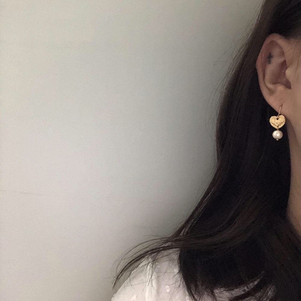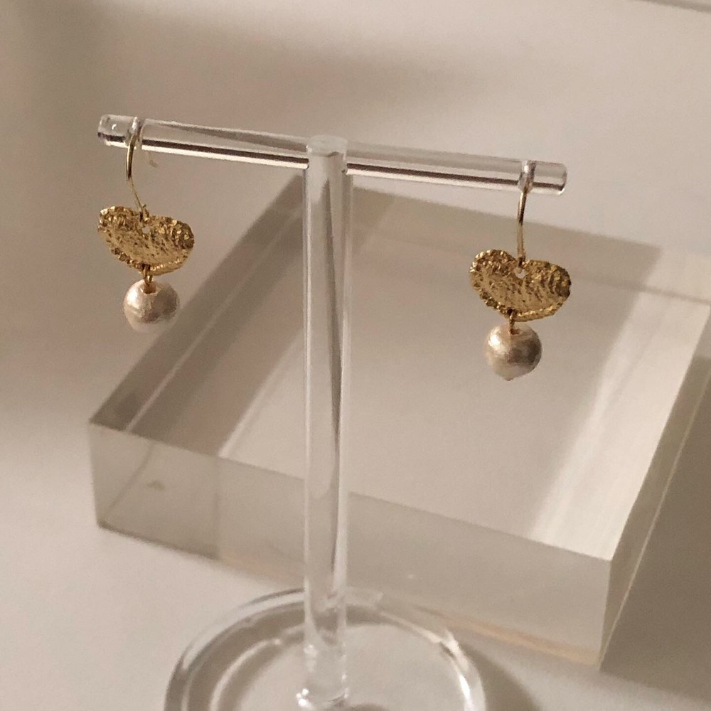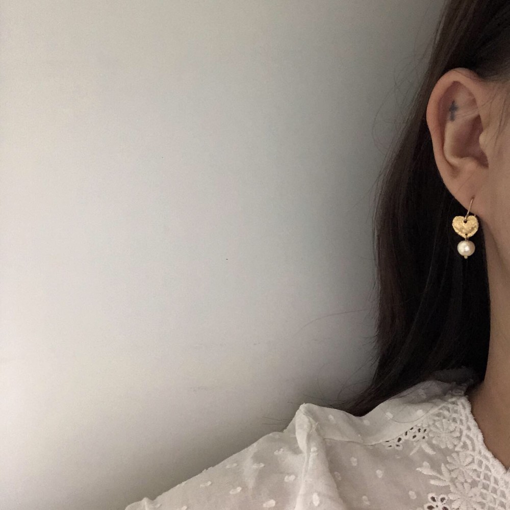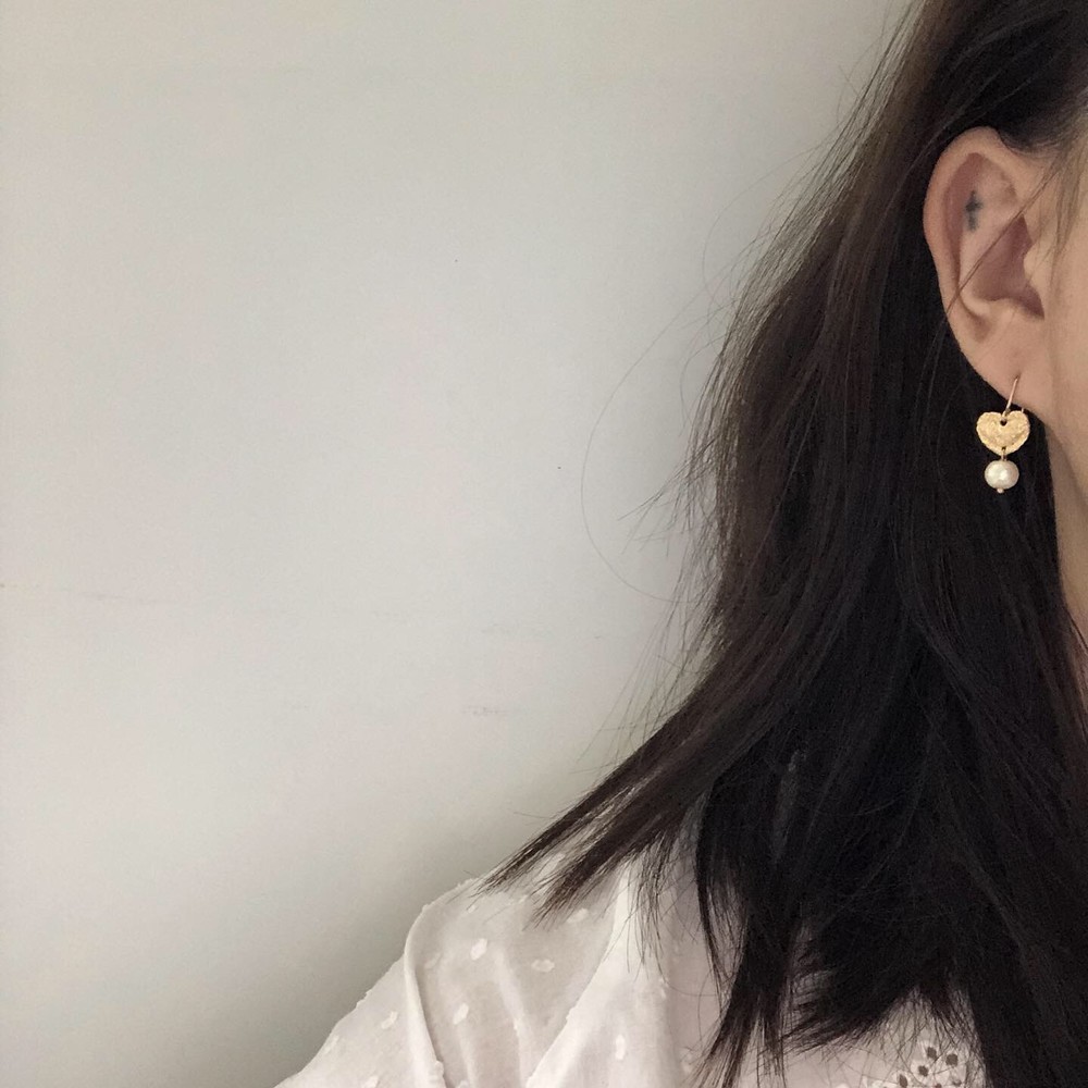 텍스처 있는 하트 유닛에 진주를 더해 제작한 사랑스러운 하트 귀걸이입니다.