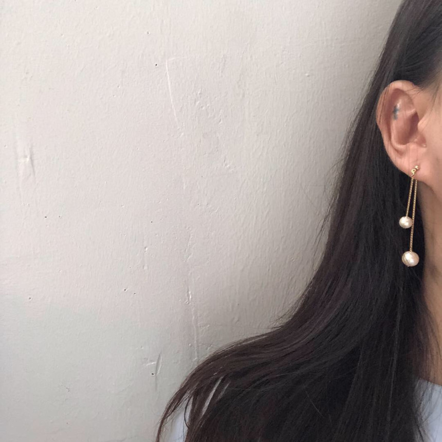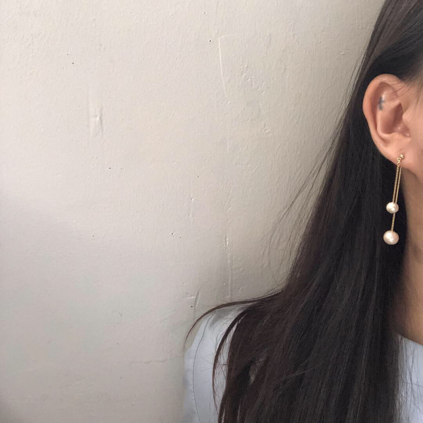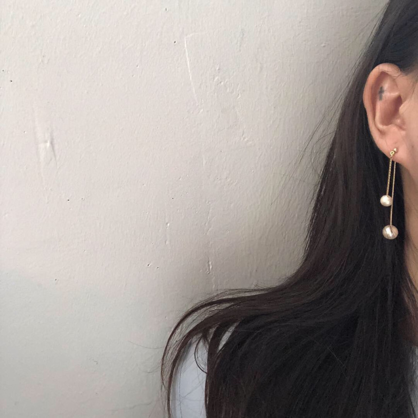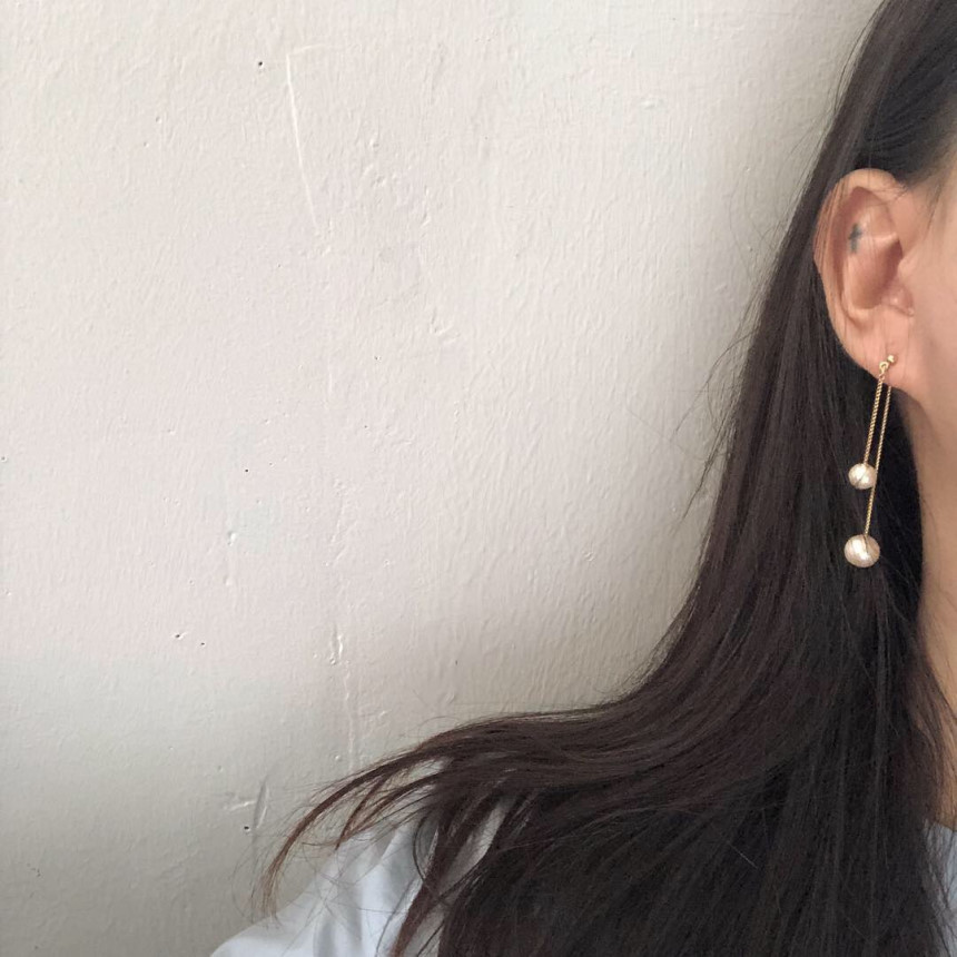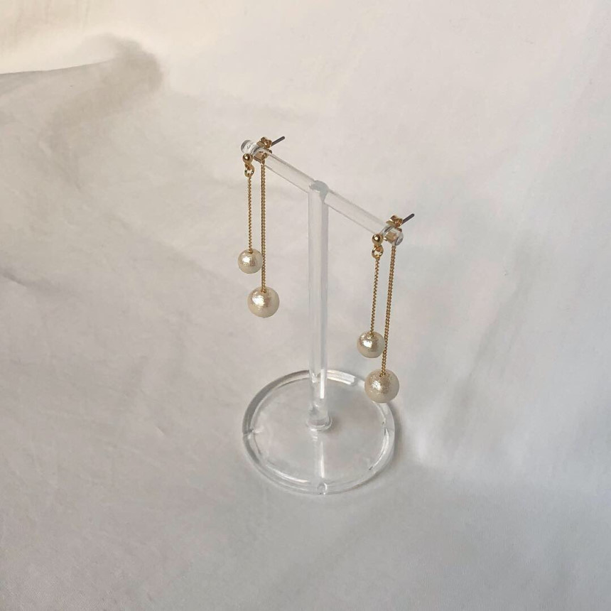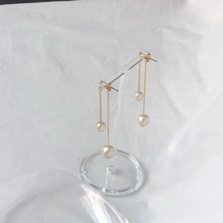 훅에 고리를 달고, 가느다란 체인에 코튼 펄을 매달아 만든 귀걸이입니다.