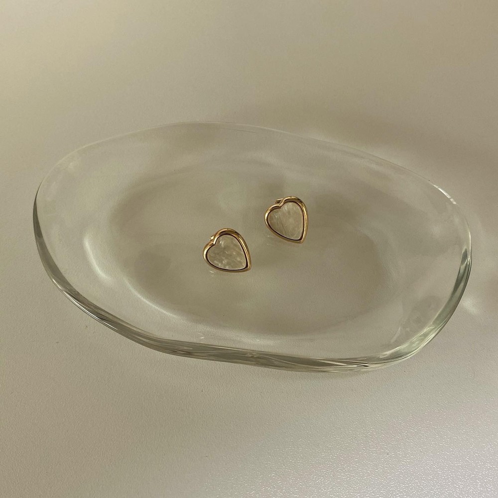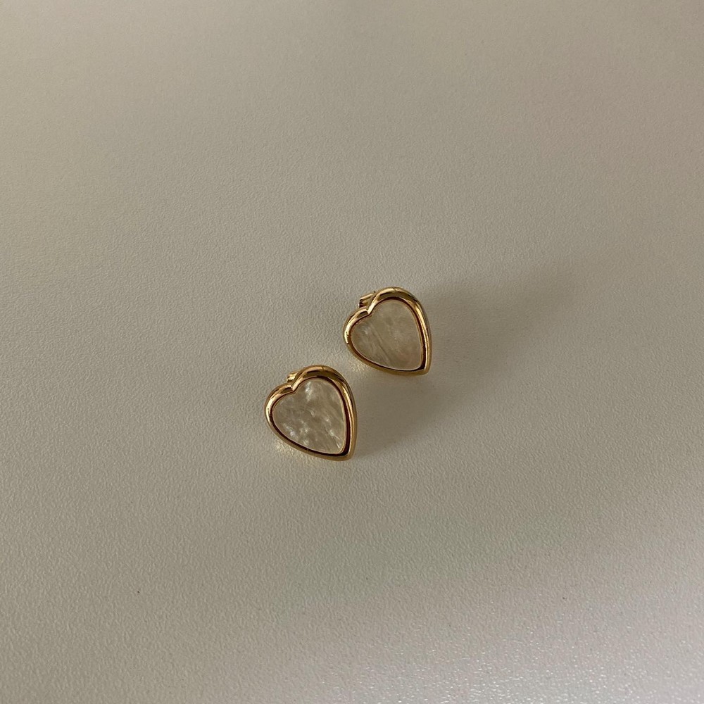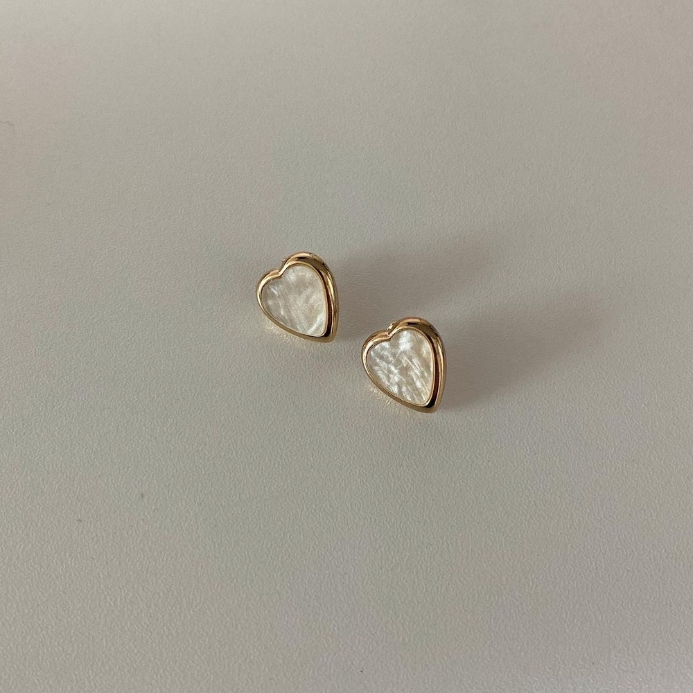 빛을 받으면 반짝이는 화이트 자개와 골드컬러의 조합이 러블리한 하트귀걸이입니다.